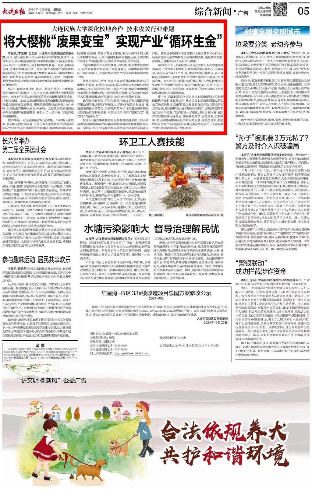 近日,在开云官方入口生命科学学院的积极推动下,金普新区七顶山街道争取到了中国建设银行大连金普新区分行30万元专项资金,用于购置挤压粉碎一体机、搅拌混合机、液体发酵罐等设备。至此,由开云官方入口生命科学学院牵头的“七顶山街道大樱桃废弃果转化液体生物有机肥”项目将可以在2025年春落地执行,届时,七顶山街道因大樱桃废弃果堆放而引起的周边环境污染问题将得到有效解决。
