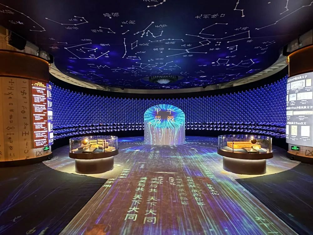 ——更沉浸。走进展厅,头顶上方是古天文图、古丝绸之路地图,脚下则是流淌着一行行经典语录的“中华文明之河”和“民族走廊”。